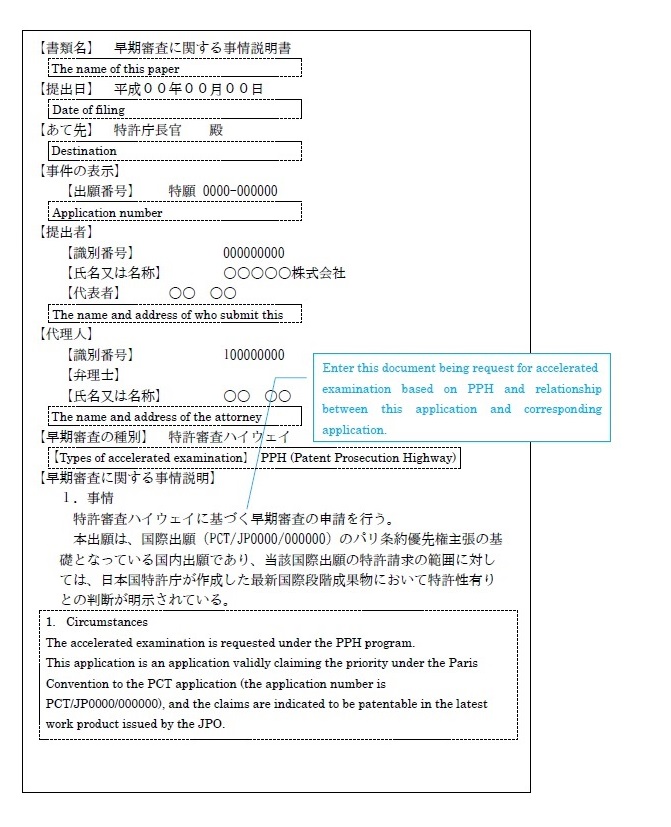 To file a Patent Prosecution Highway (PPH) request with the JPO, the applicant must submit an “Explanation of Circumstances Concerning Accelerated Examination” by attaching a “Request for Participation in the Patent Prosecution Highway (PPH) Pilot Program” (PPH Request Form)*.