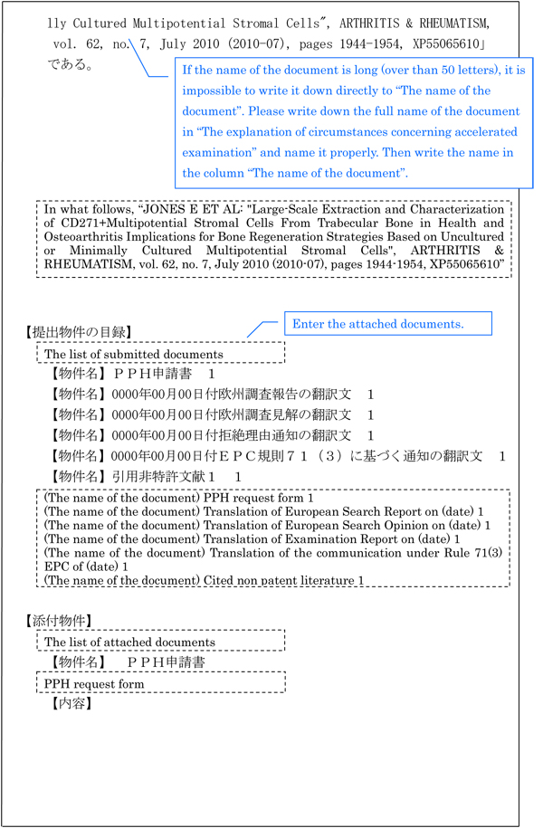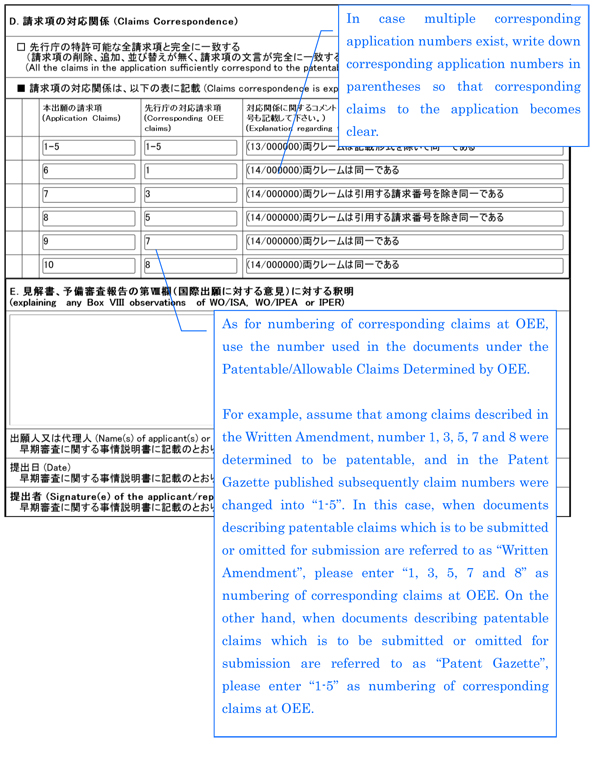- All documents required to be submitted (incl. all office actions, claims indicated as patentable, documents cited by OEE examiner, claim correspondence table) must be mentioned in either “VI. List of names of documents omitted to be submitted” of a PPH Request Form or “List of submitted documents” of an “Explanation of Circumstances Concerning Accelerated Examination.” Please note that the names of all documents required to be submitted need to be provided whether or not documents are omitted.