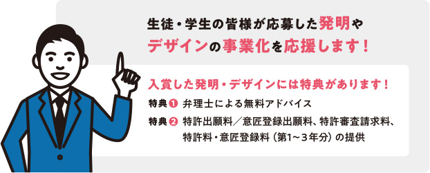 表彰された方は、特典として、出願から権利取得までの過程において、弁理士による無料アドバイスや特許出願料の提供が受けられます。
