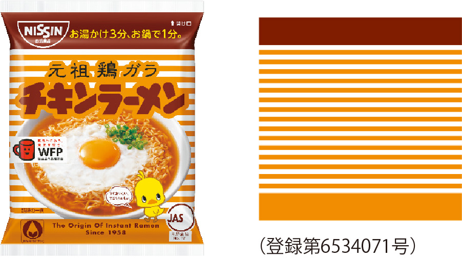 チキンラーメンを製造・販売する日清食品は、2018年に発売60周年を迎えたことをきっかけに色彩のみからなる商標を出願。ロゴなどがなくても配色のみで多くの人が当商品だと認識するだけの認知度を得ていることから、登録が認められた。この登録は、模倣品対策はもちろん、親しまれているブランドであることを世間にアピールするという点でも意義深い。同社は、カップヌードルの帯型の図形について位置商標の登録に成功している。