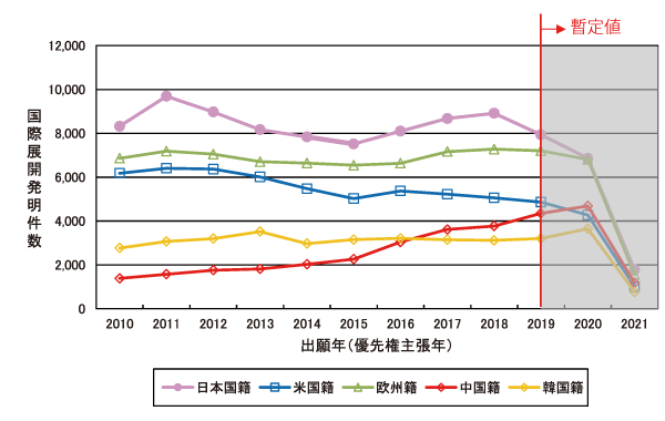 主に「発明件数」と「国際展開発明件数」の観点で分析。ある技術分野における「発明件数」を国籍・地域別または出願人別に分析することで、各カテゴリーごとの技術開発の状況を把握することができます。また、二つ以上の国・地域へ出願される発明は、1カ国のみに出願される発明に比べ、出願人自身にとって価値の高い発明と考えられるため、「国際展開発明件数」に注目することで、発明の価値や国際的な影響力を考慮した分析が行えます。