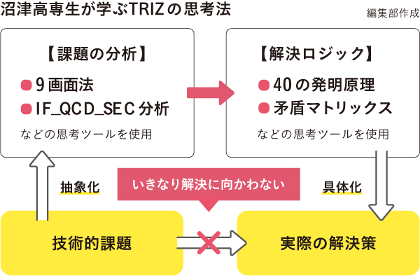 私が知財教育のキーとしているのが、技術的問題を要素分解して解決を探るTRIZ(トリーズ)という発想法です。企業ではしばしば用いられますが、教育ツールとしての使用例は極めて少ないはず。研究では、「あちら立てればこちらが立たぬ」という矛盾の壁に当たるのが常ですが、授業においても、9画面法やIF-QCD-SEC分析で問題を分析します。そして現実と理想のギャップを認識した上で、問題の本質を抽出します。その後、 TRIZの矛盾マトリックスという表に状況を当てはめ、解決のヒントとなる40の発明原理という思考パターンの中から最善なものを適用し、具体的な解決策に再度落とし込みます。地元企業との連携においても、TRIZを使った分析と改善提案を実施しています。