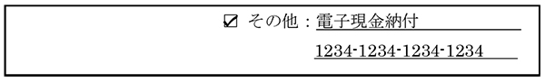 - 「支払方法」の欄の「その他」をチェックし、その右側に「電子現金納付」及び納付番号(16桁)を記載してください。