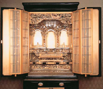 なにわのまちは日本最古の仏壇処、「大阪仏壇」は西暦552年大陸百済より海上交通の要津だった難波津(なにわづ)に経文と共に6人の仏工・造寺工などが遣わされたことに始まり、西暦593年聖徳太子が四天王寺建立の際にも百済から技術者を呼び寄せ現在の上町台地に住まわせ、のちに、これらの技術者により仏具の産地が形成され大阪独特のすぐれた制作技術・技法が大阪府下一円に広がりました。各宗派用に違った型の仏壇を制作、高蒔絵や優雅な彩色、錺金具で各宗派の違いを出しています。